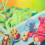These are portraits of creative women, depicted in the space where they create, along with their own art objects and talismans. They are not strangers to me; they are my muses, my colleagues and friends. Their stature and material references a rich history of seated portrait paintings, often transcribed through a male gaze. I want these subjects to see me as I them; proud of their creative achievements, colorful, intimate, and inspiring. I seek their approval while also putting them on a pedestal.